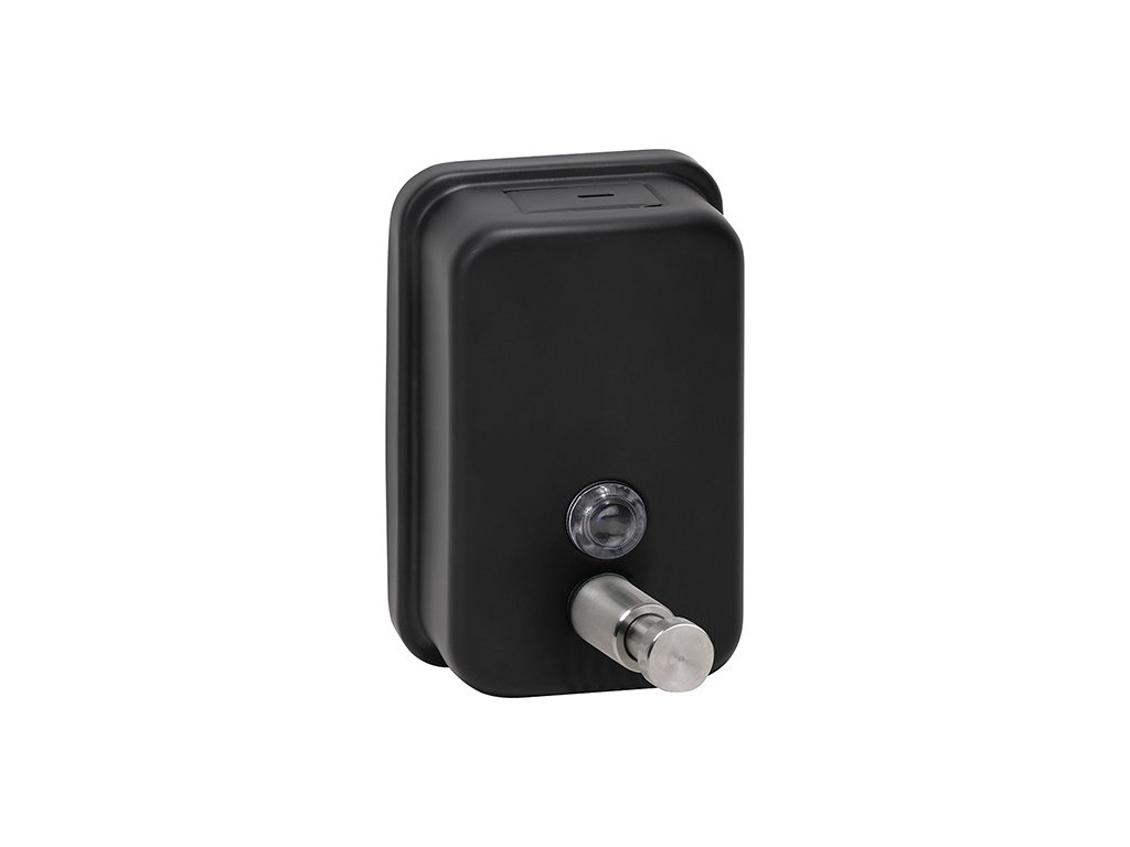 Černý nerezový dávkovač tekutého mýdla s objemem 50 ml. S manuálním ovládáním Určený pro instalaci na zeď.