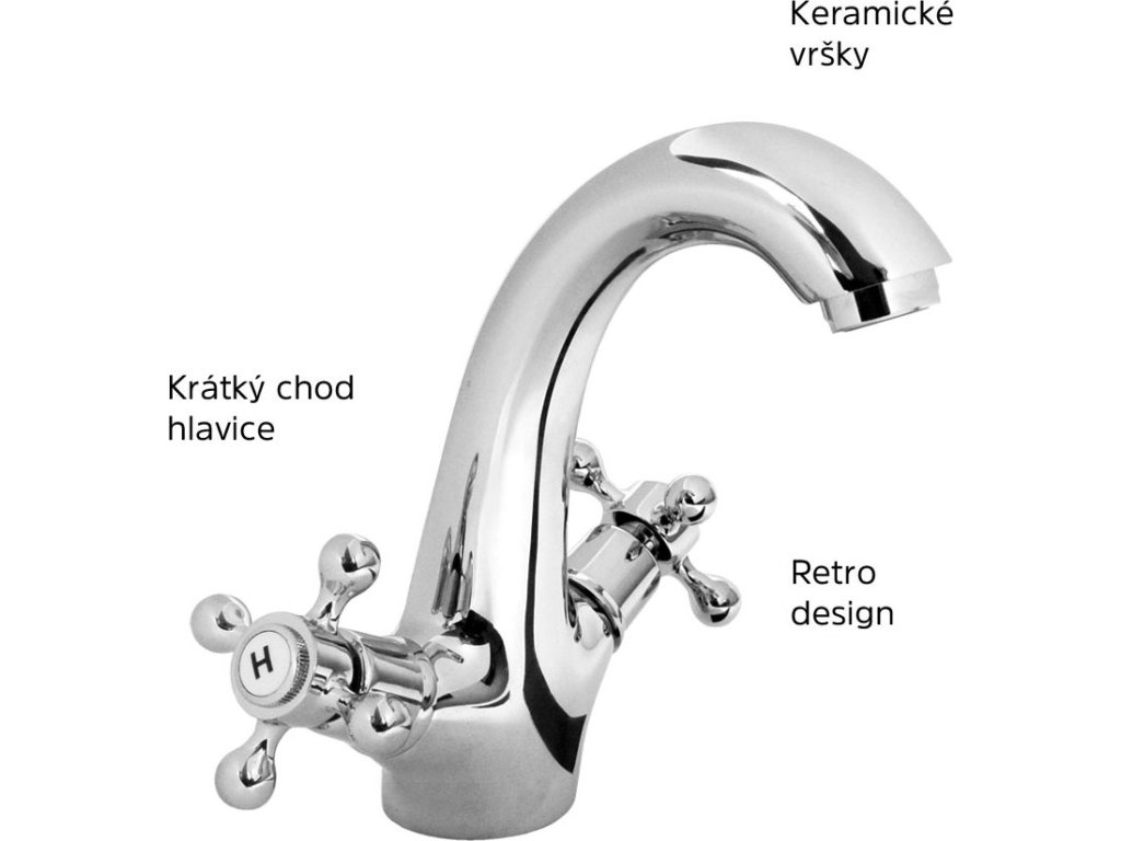 Tato umyvadlová stojánková baterie, patří do série dvouručkových vodovodních baterií Retro Viktorie, která se vyznačuje zajímavým designem a masivním provedením, vč. příslušenství. Série Retro Viktorie vás ohromí svým elegantním retro vzhledem, dlouhou životností a kvalitní povrchovou úpravou. Baterie má krátký chod ovládací hlavice, k plnému otevření stačí otočení o 90°.