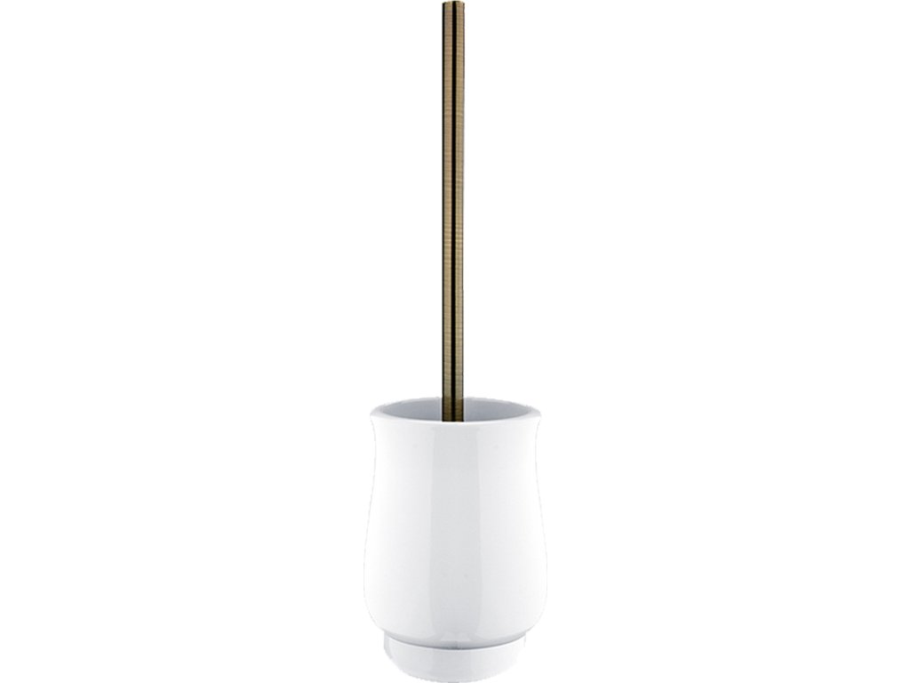 Keramický volně stojící WC kartáč. Rukojeť kartáče kovová. Povrchová úprava rukojeti staromosaz.