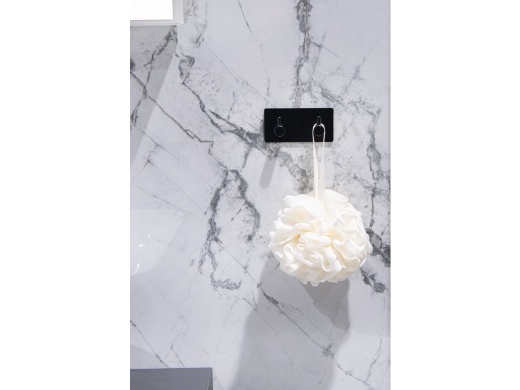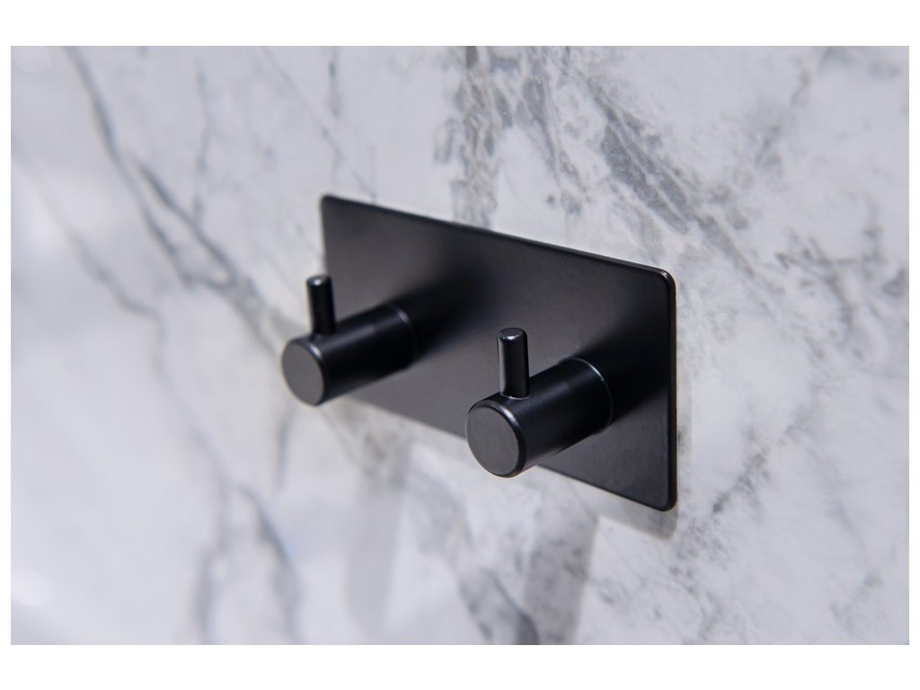 Hranatý 2-věšák - háček z kvalitní, černě lakované, oceli Největší výhodou tohoto věšáku je jednoduché lepení na obklady pomocí velice silné 3M pásky. Samolepící koupelnové doplňky jsou ideálním řešením, pokud nechcete vrtat do obkladů. Velmi kvalitní lepící páska 3M přilne k různým povrchům a umožňuje snadné odstranění doplňků bez zanechání stop či poškození. Jeho maximální nosnost je 4 kg.