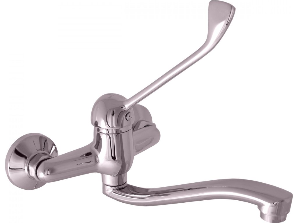 Vodovodní baterie dřezová/umyvadlová nástěnná s plochým "S" ramínkem 195 mm a s lékařskou pákou.