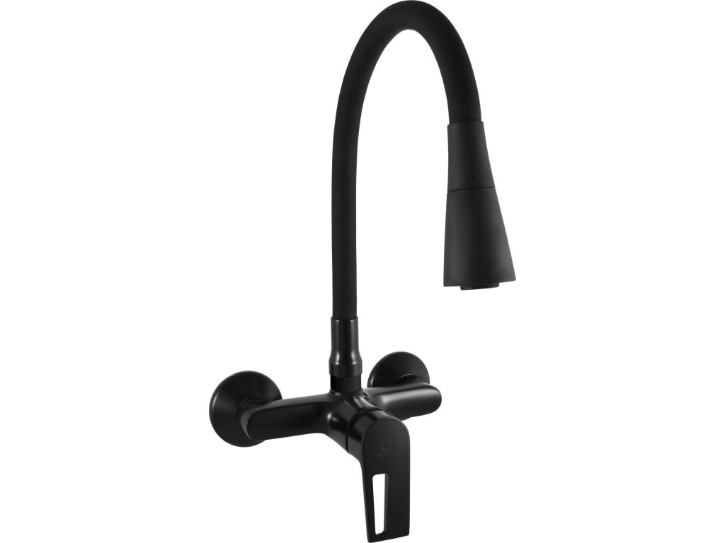 Vodovodní baterie dřezová nástěnná s flexibilním otočným ramínkem se sprchou.