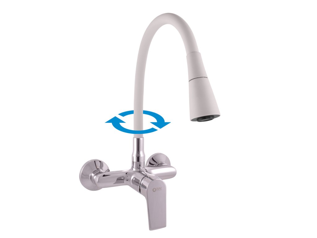 Vodovodní baterie dřezová nástěnná s flexibilním otočným ramínkem se sprchou.