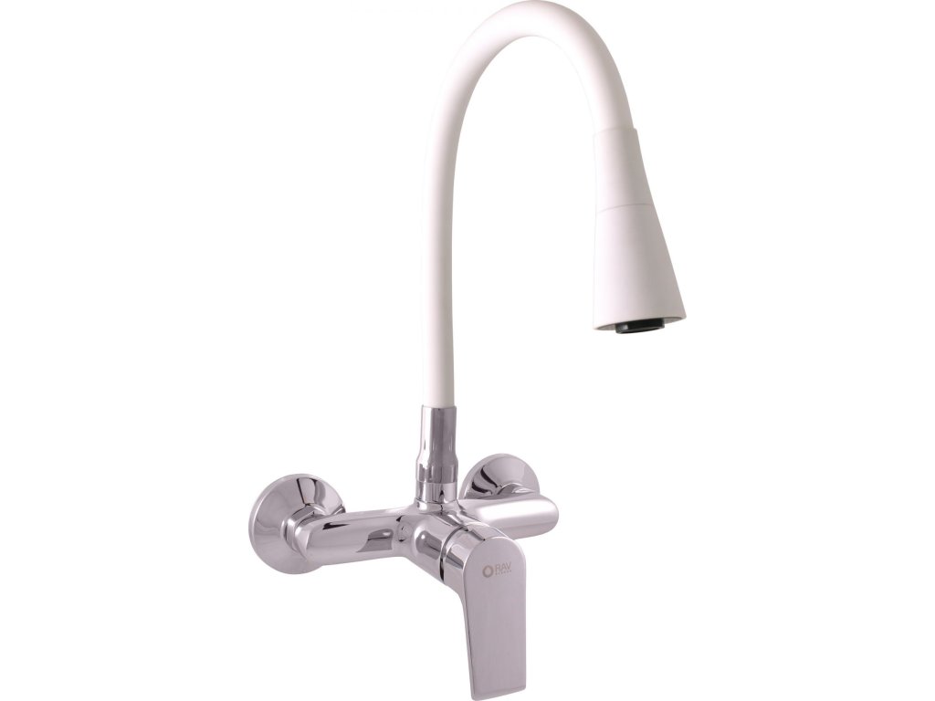 Vodovodní baterie dřezová nástěnná s flexibilním otočným ramínkem se sprchou.