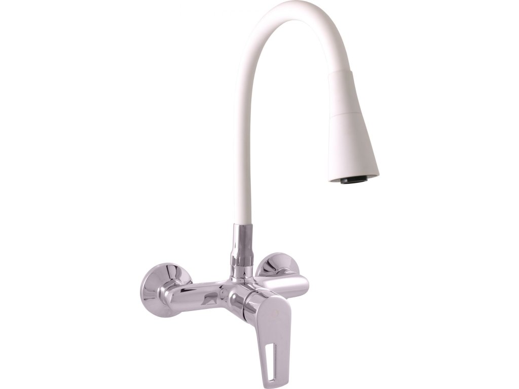Vodovodní baterie dřezová nástěnná s flexibilním otočným ramínkem se sprchou.