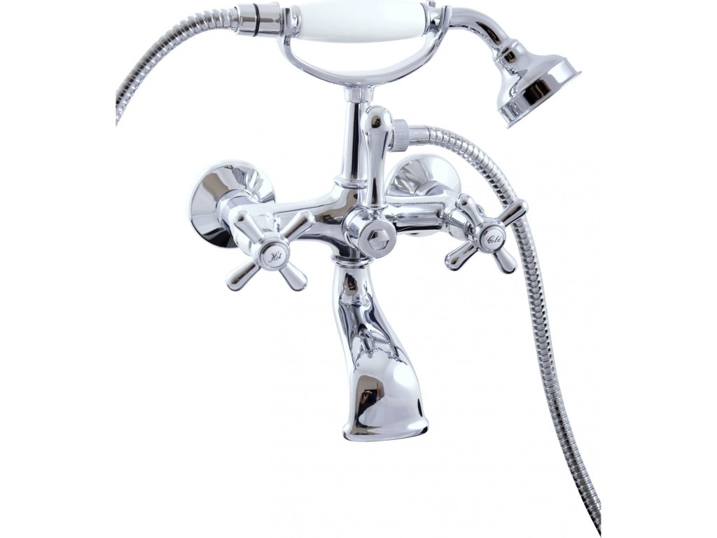Vodovodní baterie vanová nástěnná s vidlicí na odkládání sprchy a se sprchou.