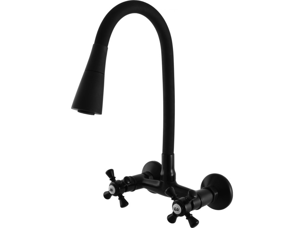 Vodovodní baterie dřezová nástěnná s flexibilním ramínkem se sprchou.