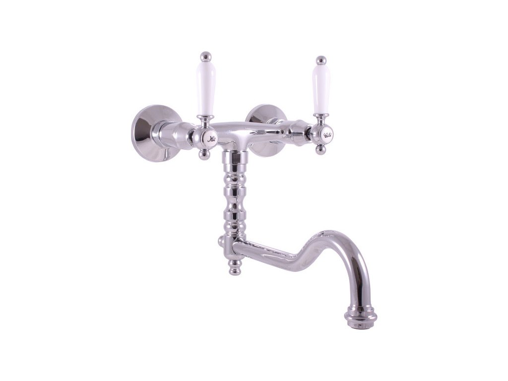 Vodovodní baterie dřezová nástěnná s kulatým otočným ramínkem.