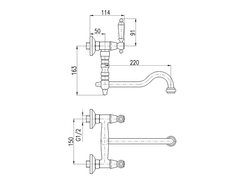 Vodovodní baterie dřezová/umyvadlová nástěnná s kulatým otočným ramínkem.