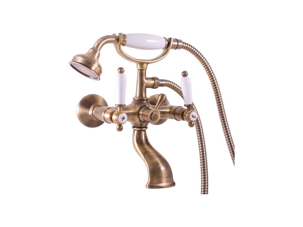 Vodovodní baterie vanová nástěnná s vidlicí na odkládání sprchy a sprchou. Keramické páky.