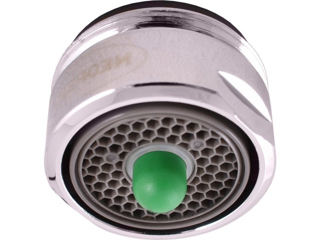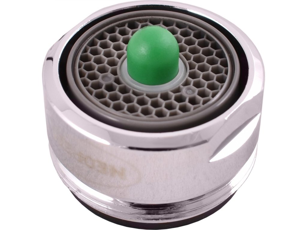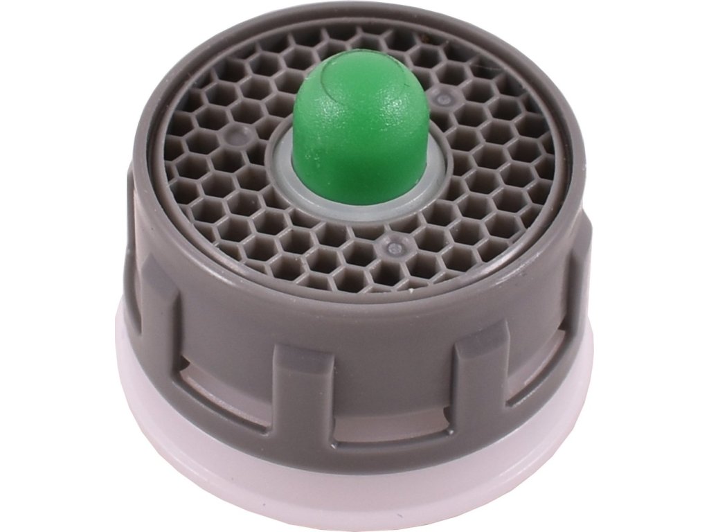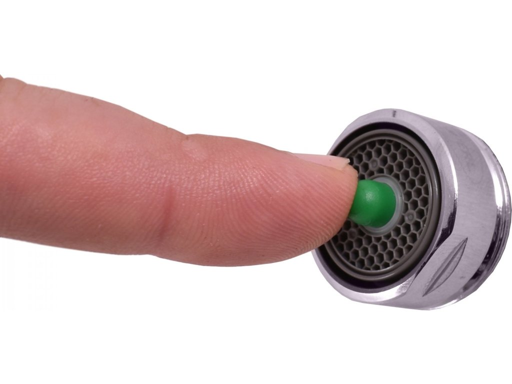 Nový typ perlátoru, který vám uspoří 50 % vody. Perlátor má charakteristický zelený knoflík, kterým přepínáte mezi dvěma průtoky vody. V úsporném režimu proteče kohoutkem o polovinu méně vody bez ztráty komfortu.