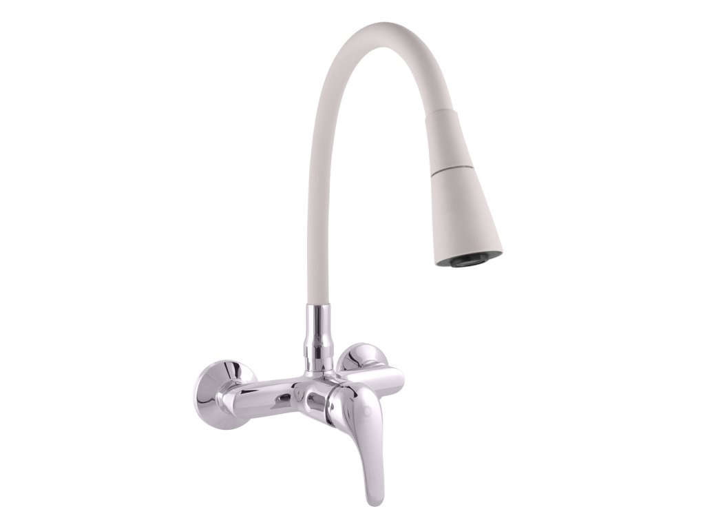 Vodovodní baterie dřezová nástěnná s flexibilním otočným ramínkem se sprchou.